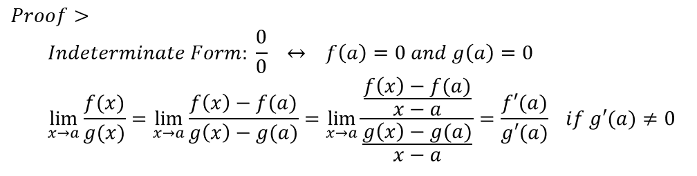이렇게 극한이 부정형을 띨 경우에만, 로피탈 정리를 사용할 수 있습니다. 모든 극한 계산에 적용되지는 않습니다. 즉, 다시말해 로피탈의 정리는 극한의 부정형에서만 성립합니다. 로피탈 정리의 엄밀한 증명은 미적분학에서 다루지 않습니다. 간단하게 그 흐름만을 다뤄보도록 하겠습니다! 결론적으로 로피탈은 미분 가능한 함수 혹은 미분 가능한 구간 내의 함수 f(x), g(x)에 대해 아래의 관계를 만족시킵니다.