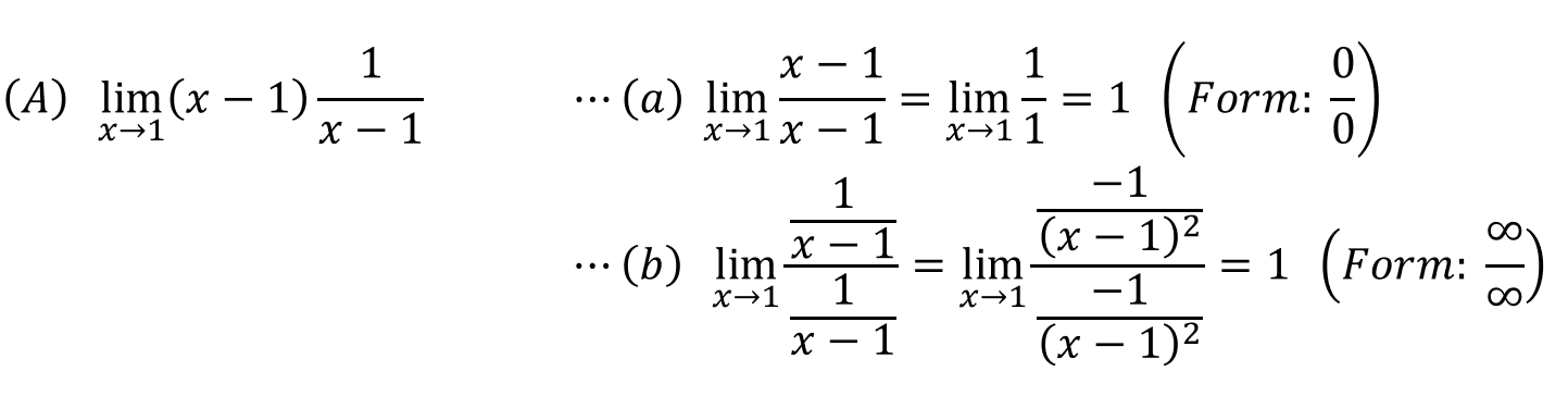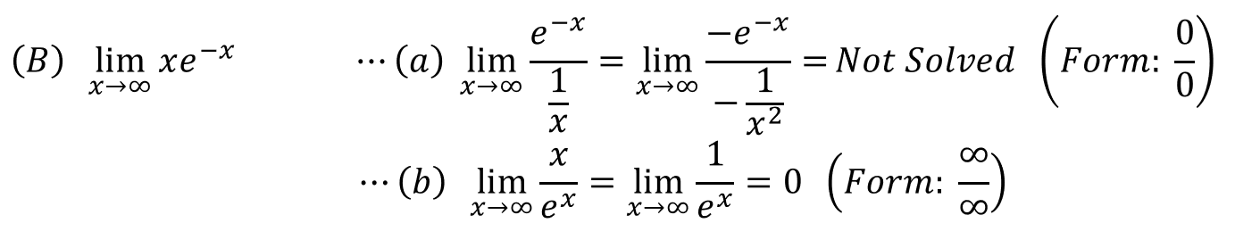 어떤가요? 이번에도 쉬운 예제들이죠? 사실상 (A)-(b)는 (B)-(a)처럼 Not Solved가 되어야 합니다. 하지만, 분자와 분모가 동일하다는 특수한 상황으로 인해 1이라는 값을 얻었습니다. 위에서 말한 바와 같이 CASE 1을 2개로 만들어 풀었습니다. 이처럼 CASE 1의 두가지 부정형 꼴 중에 아주 쉽게 극한값을 찾을 수 있기도 하고 아예 풀 수 없게 되기도 했습니다. 이것이 CASE 2 부정형의 특징입니다. 따라서 상황에 따라 적절하게 0/0꼴로 바꿀 것인지 아니면 ∞/∞꼴로 바꿀 것인지 잘 생각해서 선택하여야 합니다.