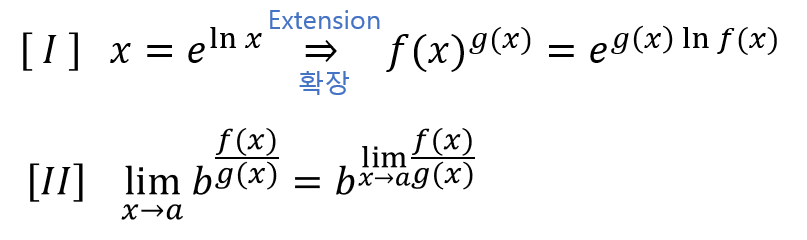 [I], [II]의 이 두가지의 형태와 이론에 대해서 간단하게 설명하고 넘어갈게요. 먼저, [I]의 경우, 지수함수 형태(Exponential Form)로 변화시킬 수 있습니다. 그리고 [II]의 경우, b가 상수라면, 극한은 지수로 옮길 수 있다는 이론입니다. 이는 여기서 따로 증명하시 않겠습니다. 그리고, 각각이 그렇게 어려운 부분은 아니므로 바로 예시를 보도록 하겠습니다.