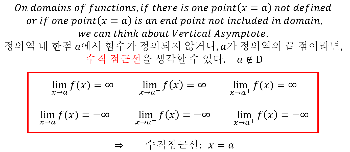 수직 점근선은 수평 점근선과 반대입니다. 어떤 함수 f(x)가 정의역 내에서 정의가 되지 않는 점과 그 점에서의 극한이 수렴하지 않는 경우 수직 점근선을 갖는다. 수평 점근선은 양의 무한대와 음의 무한대에서의 수렴값을 확인했지만, 수직 점근선은 정의역 내의 특정한 Point에서의 수렴 발산 여부를 따집니다. 따라서 아래와 같이 정리할 수 있습니다.