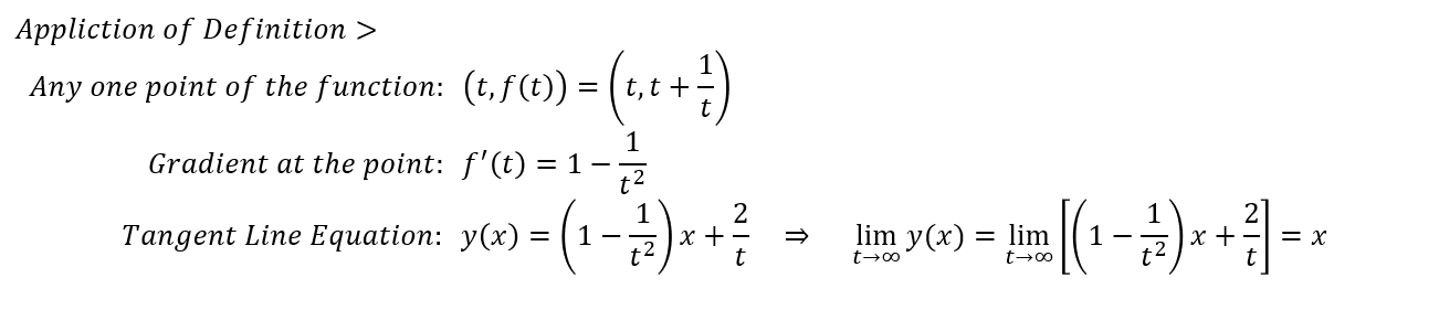 이렇게 일반적인 형태로 사선 점근선을 정의할 수 있습니다. 이렇게 사선 점근선을 구해볼 수 있습니다. 하지만, 생각보다 되게 애매하다고 느껴질 수 있습니다. 그리고 이게 정말 맞는지도 확신이 안 갈 수도 있습니다. 그래서, 이를 응용해 더욱 확실히 사선 점근선을 구할 수 있습니다. 사선 점근선을 확실히 구할 수 있는 방법은 접선의 방정식(Tangent Line Equation)을 이용하는 방법입니다. 어떠한 한 점 ( t, f(t) )에서의 기울기(Gradient)를 구해 접선의 방정식을 구해 이에 대해 극한을 취하면, 사선 점근선을 구할 수 있습니다. 아래는 위의 예시를 통해 사선 점근선을 구한 결과이다.