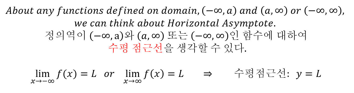 수평 점근선은 간단합니다. 그냥 단순히 어떤 함수 f(x)가 음의 무한대 혹은 양의 무한대에서 특정 상수로 수렴하면 항상 수평 점근선을 가집니다. 간단하게, 양 혹은 음의 무한대에서 극한이 수렴하면, 수평점근선이 존재합니다. 수평 점근선의 정의는 x축에 평행하고, y축에 수직인 직선 중에 함수가 점점 가까워지는 한 직선을 의미합니다.